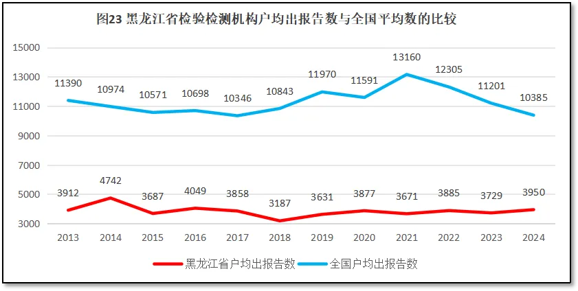 2024年度,黑龙江省检验检测机构户均出具检验检测报告3950份,是全国平均水平10385份的38%,全国排名第30位(较2023年度排名提升1位)。从2013年以来,黑龙江省检验检测机构户均出具检验检测报告数量与全国的比较如图23所示。