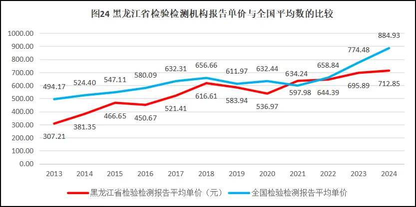 来看黑龙江省检验检测报告单价的情况,过去12年黑龙江省检验检测报告单价与全国情况的比较如图24所示。