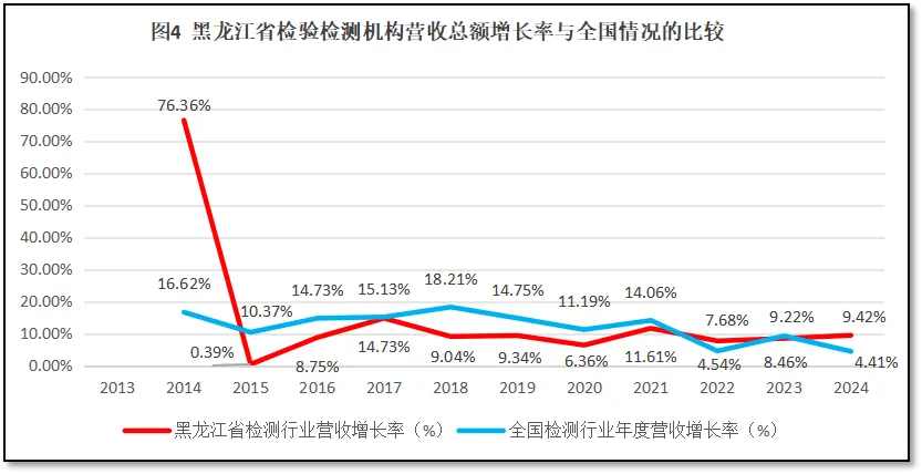 由图4可见,总体来看,除了第一年的离群数据之外,从2015年到2021年,黑龙江省检验检测行业年度营收总额的增长率曲线一直低于同期全国检验检测机构年度营收增长率曲线,仅在2022年和2024年出现了高于全国平均增速的情况。总的来看,近十年黑龙江省检验检测机构营收增长率平均值为8.58%,比全国平均数11.66%低了不少,2024年虽然增速达到了全国平均数的一倍多,但由于区域经济落后以及检验检测行业基础过于薄弱,黑龙江省检验检测行业总体发展的步伐显得很缓慢。