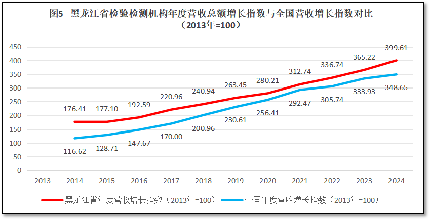 由上图可见,黑龙江省检验检测机构营收总额增长指数虽然一直保持着高于全国平均数的水平发展,但高出并不多,到2024年增长指数的差距略有增大,但也相差仅50左右,说明黑龙江省检验检测行业发展质量一般,在过去12年中没有显示出特别大的发展优势。