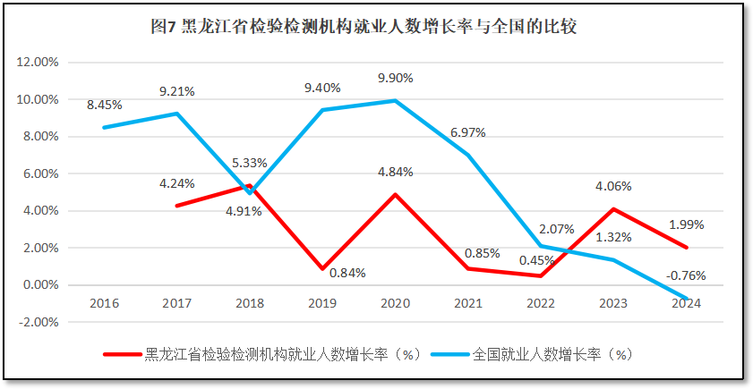 黑龙江省检验检测机构就业人数增长率与全国检验检测机构就业人数增长率的比较如图7所示。