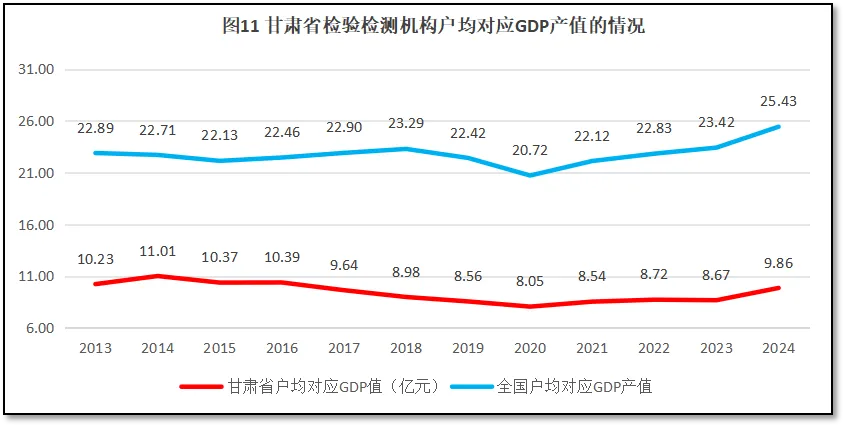甘肃省2024年度地区生产总值(GDP值)13002.9亿元,全国排名第27位,与2023年度排名持平。甘肃省1319家检验检测机构,户均对应的GDP值为9.86亿元,比全国平均水平的25.43亿元低了15.57亿元,排名跟2023年度一样,仍然是全国倒数第一。过去12年甘肃省检验检测机构户均对应的GDP值与全国的情况比较如图11所示。
