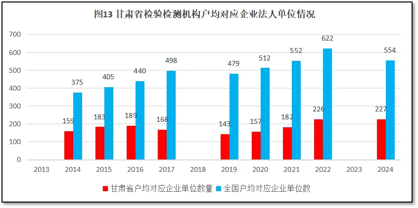 再来看检验检测机构户均对应的企业法人单位数量情况。过去12年甘肃省地区检验检测机构户均对应企业法人单位数量与全国情况的比较如图13所示。