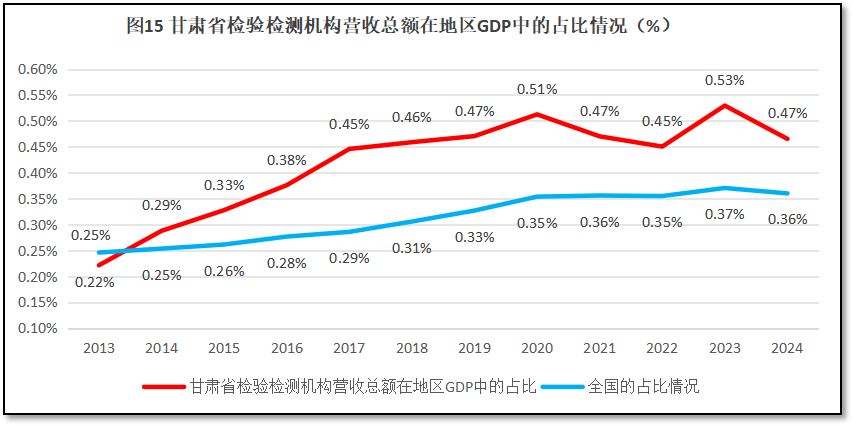 再来看甘肃省检验检测机构营收总额在其地区生产总值GDP中的占比情况。2024年度,甘肃省检验检测机构营收总额60.50亿元,占当年甘肃省GDP值的0.47%,比全国平均值0.36%高出0.10%,排名全国第5位,较2023年度排名提升1位,这不仅是甘肃省各项指标中排名最为靠前的一项,也是2024年度排名唯一出现提升的指标。过去12年甘肃省检验检测机构营收总额在当地GDP值的比例变化情况如图15所示。