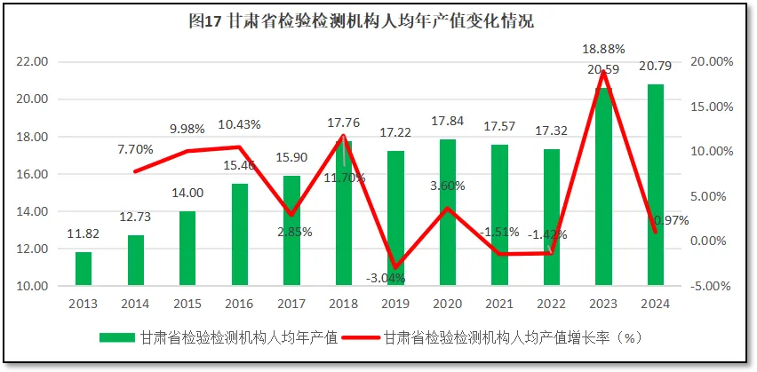 由图16可见,2020年之前,甘肃省检验检测机构营收总额增长率一直高于当地GDP的增长率,仅在2021-2022年短暂低于当地GDP增长率。2023年,甘肃省检验检测机构营收总额出现25.42%的高增长,但2024年又出现了首次负增长,拉低了过去12年甘肃省检验检测机构营收总额的年均增长率。2015年以来,甘肃省检验检测机构年度营收总额的年均增幅为12.79%,比同期其区域GDP的年均增速7.21%高不少。这说明,尽管甘肃省区域经济发展速度一般,但甘肃省地方政府在扶持检验检测行业发展方面不遗余力,推动了检验检测行业的快速发展。不过,2024年出现的多项指标停止增长的现象,可能意味着甘肃省检验检测行业发展状况正在面临改变。