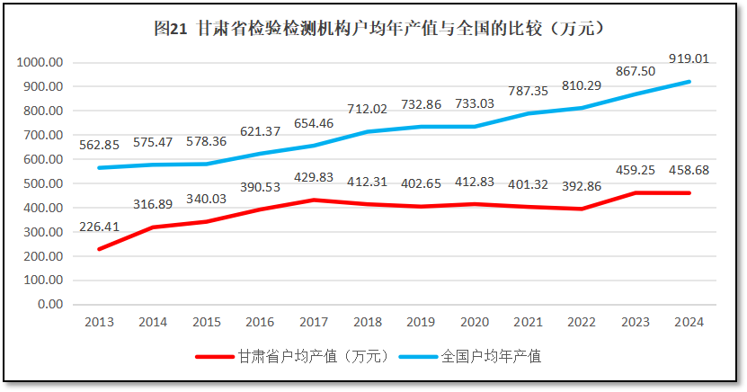 由图21可见,甘肃省检验检测机构户均营业收入增长总体比较迟缓,数值一直低于全国平均数,且与全国平均数的差距越来越大(2023年甘肃省的曲线虽有小幅反弹,但2024年又再度下滑,总体差距持续增大)。这说明甘肃省检验检测机构整体的经营状况一般,户均产值长期没有太显著增长,发展质量堪忧。
