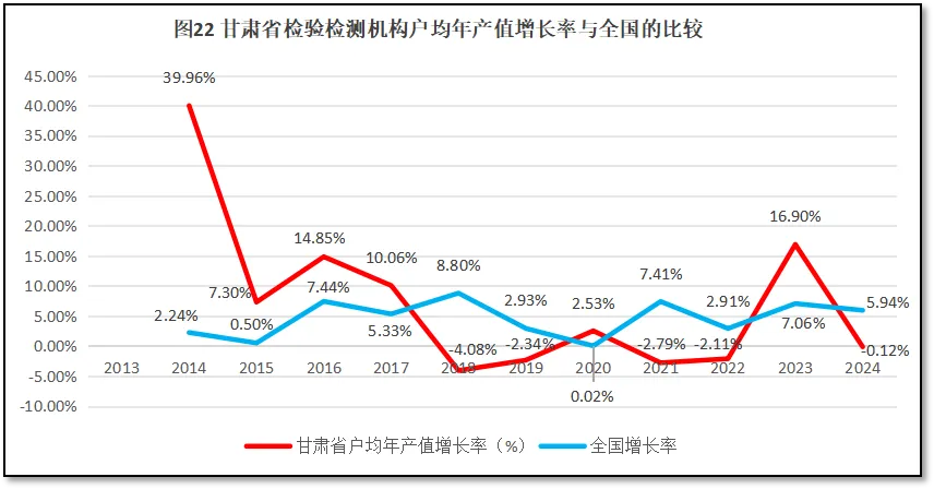 由图22可见,甘肃省检验检测机构户均营收增长率曲线在2017年之前高于全国平均数,但2018-2022年期间多数时间低于全国平均数,直到2023年才出现一个高于全国平均数的增长高峰,2024年再度回落,低于全国平均数。总体来看,甘肃省检验检测市场仍然有一定发展动能,但由于基础过于薄弱,且长期处于低速发展,其结果是与发达省份的差距越来越大。