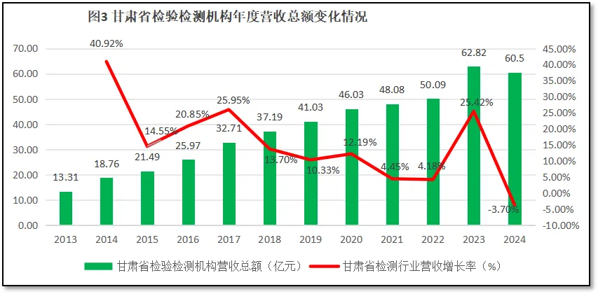 甘肃省由于地处西北地区,自然条件恶劣、交通不便,经济基础相对薄弱,虽然近年来甘肃省经济增速很快,但与沿海经济发达地区相比差距甚大。可以看到,近年来甘肃省检验检测行业总体发展速度较快,在全国的地位也有所提升,但由于区域经济限制,发展质量一般,2024年度多项指标发展遇阻,未来走势具有较大的不确定性。