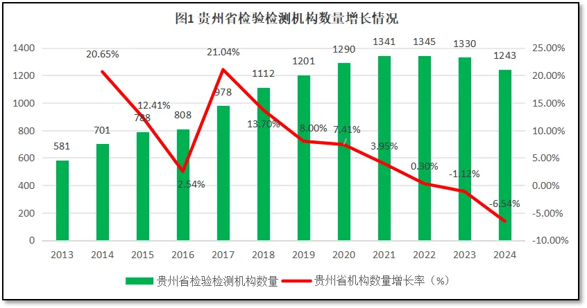由图1可见,2022年之前,贵州省检验检测机构数量总体保持增长,从2013年的581家增长到2022年末的1345家。从2022年之后,贵州省检验检测机构数量连续两年出现下降,2024年末的机构数量回落到1243家,较2022年的峰值已经净减少约100家机构。从增长率看,2016年之前,贵州省检验检测机构数量增长率从高位逐年下降,在2016年出现一个增长低谷,但在2017年出现了一个21.04%的较高反弹增幅,此后增长率再度逐年下降,逐步走低,2024年度的同比增幅下降到-6.54%,是历年下降幅度最大的一次。十二年来贵州省检验检测机构数量的年均增长率为7.48%,略高于同期全国7.23%的年均增长水平。