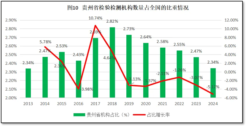 由图10可见,贵州省检验检测机构数量在全国检验检测机构总数中的占比呈现先升后降的变化,从2013年的2.34%逐步增长到2018年的2.82%,此后逐年下降,到2024年占比再次回落到2.34%,与12年前的2013年占比相同。贵州省检验检测机构的数量规模在2022年停止增长并逐步下降,加快了贵州省检验检测机构数量占比的回落,再加上贵州省检验检测行业基础较为薄弱,其在全国检验检测行业中的地位并没有明显增长。