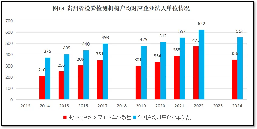 由图13可见,2022年之前,贵州省检验检测机构户均对应的企业法人单位数量逐年上升,但一直低于全国平均数。2024年贵州省检验检测机构户均对应企业法人单位356个,比全国平均数554个低了198个。以2024年度的统计数据计,贵州省地区企业法人单位数量超过44.2万个,位居全国第21位,排名相对靠后,且较2023年度排名下降了1位,但与贵州省检验检测机构的数量排名相当。这说明,对于贵州省的企业法人单位数量来说,贵州省地区检验检测机构显得多了一些,但贵州省的检验检测机构的数量已经停止增长,说明贵州省检验检测行业结构正在优化改善,与区域经济发展状况的匹配性在增强,这对于提升贵州省检验检测行业生态和发展潜力很有利。