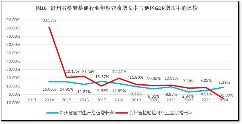 从图15可见,贵州省检验检测机构营收总额在当地GDP中的占比保持增长,但数值一直低于全国平均数,2024年贵州省检验检测机构营收总额出现下降,在当地GDP中的占比也出现较大降幅,与全国平均数的差距有拉大的迹象。这说明贵州省检验检测行业起点较低,基础薄弱,虽然近年来保持增长,在当地经济体系中的作用也越来越重要,但相对于经济发达地区而言仍然落后,行业贡献率低于全国平均水平。2024年贵州省检验检测行业遭遇发展瓶颈,在区域经济中的地位也有下降,转型过程的困难较大。
