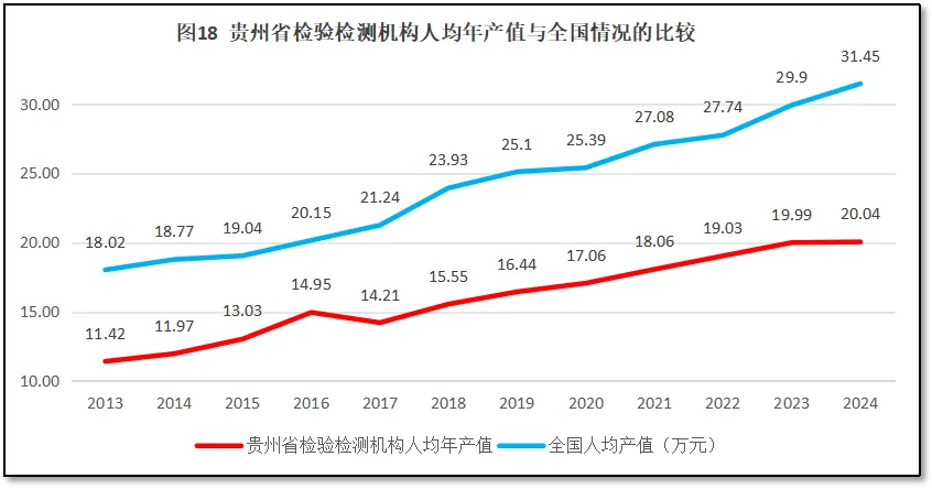 由图18可见,过去12年,贵州省检验检测机构人均年产值保持增长,但与全国平均数有不小差距,且近年来差距没有明显缩小。2024年贵州省检验检测机构人均年产值比全国平均数低了11.41万元,贵州省的追赶之路仍然任重道远。