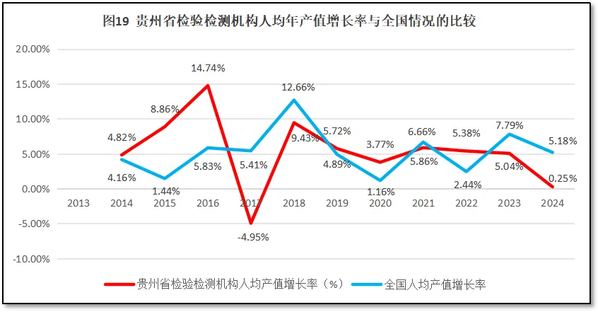 再来看贵州省检验检测机构人均年产值增长率与全国人均年产值增长率的比较,如图19所示。