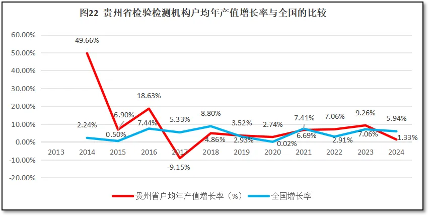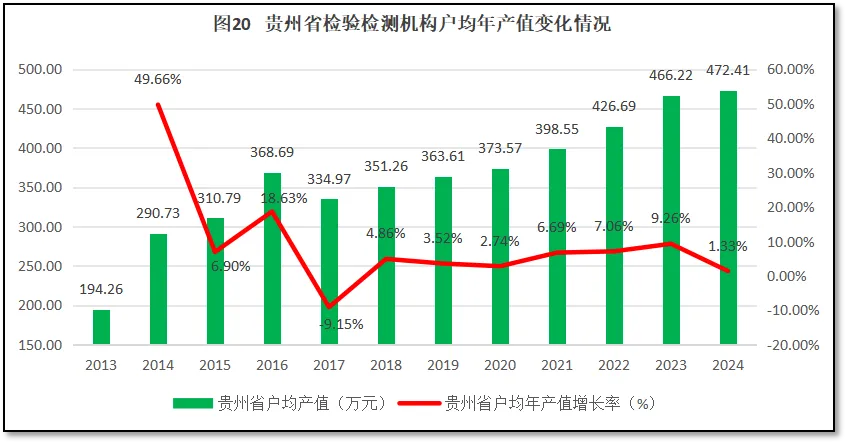 从增长率来看,过去12年来,贵州省检验检测机构人均年产值增长率在2017年出现一次异常下跌,其他年份保持较平稳增长,不过2024年度增幅非常微小,仅有0.25%,十二年来的年均增幅为5.35%,略高于同期全国平均数5.23%。这表明贵州省地区检验检测机构经营状况尚可,发展势头较好,但由于基础过于薄弱,目前行业发展质量和竞争力还不高。