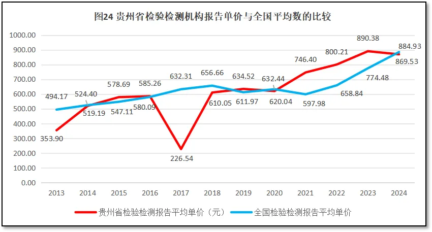 由图24可见,除了2017年的异常数据,贵州省检验检测报告的单价总体呈现缓慢上升的趋势,比较符合一般市场发展的趋势。2013年贵州省检验检测报告单价353.90元,到2024年增长到869.53元。2021-2023年贵州省检验检测报告单价超过全国平均数,但2024年略低于全国平均数。总体来说,贵州省检验检测报告单价缓慢走高并企稳,与全国平均水平十分接近,说明贵州省检验检测行业的经济效应可以得到较好的保障。