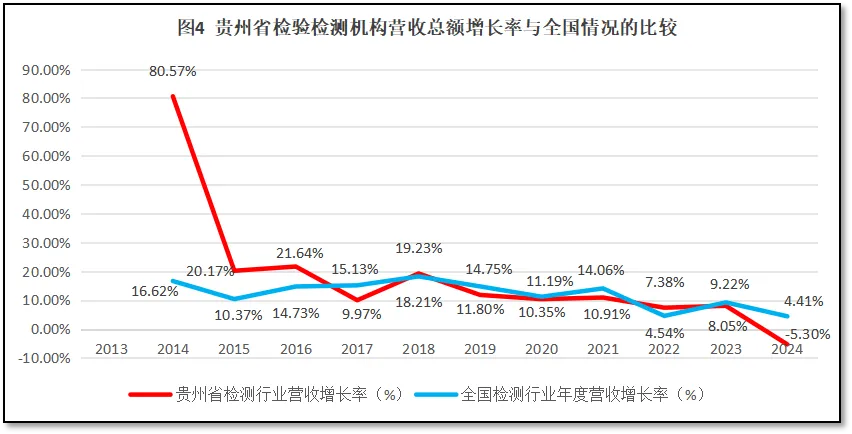 由图4可见,刨除头两年误差较大的数据,贵州省检验检测机构营收总额的增长率与全国的发展速度和变动节奏十分接近,多数年份增长率略低于全国平均数,但低出不多,发展比较平稳,进程中规中矩,说明贵州省检验检测行业在过去10年期间发展比较稳健,与全行业发展节奏相似。不过2024年贵州省检验检测机构营收总额出现较大降幅,是历年少有的现象,需引起贵州省的同行们注意。