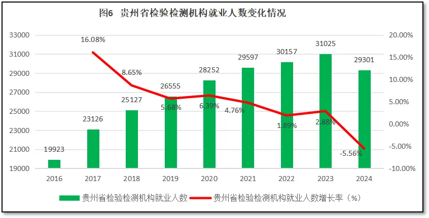 由图6可见,最近9年,贵州省检验检测机构从业人员数量从2016年的1.99万人增长到2023年的3.10万人之后,2024年出现下降,就业人数回落到2.93万人,较2023年度净减少约1700人。从增长率曲线看,贵州省检验检测机构从业人数增长率逐年下降,从2017年的16.08%逐步下降到2024年的-5.56%,这一发展特点符合基数增大后的增长率变化规律,也说明贵州省检验检测行业的收缩不仅是机构数量的减少,还包括就业人数的下降。