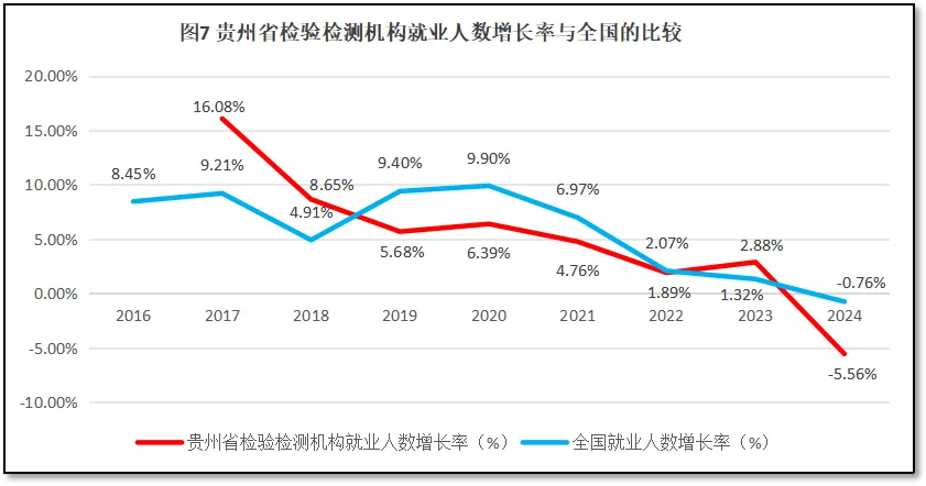 贵州省检验检测机构就业人数增长率与全国检验检测机构就业人数增长率的比较如图7所示。