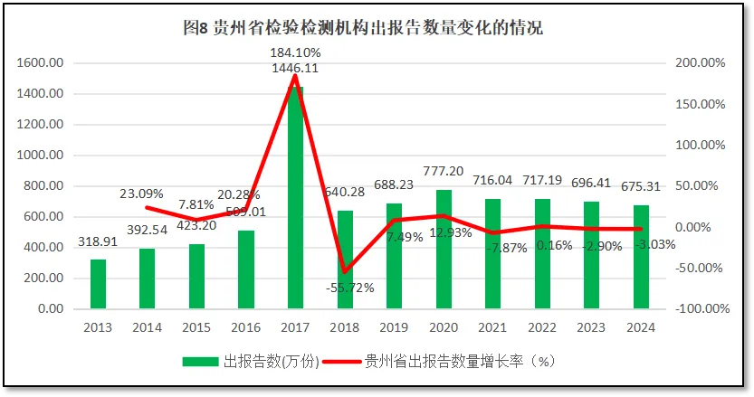 从图8来看,贵州省检验检测机构对外出具报告数量总的趋势是先增后降,从2013年的318.91万份增长到2020年的777.20万份,最近几年贵州省检验检测报告数量出现回落,2024年检验检测报告数量为675.31万份(2017年贵州省检验检测报告数量出现一个异常增长的峰值,报告数量达到1446.11万份,疑似数据错误,故不以此数据作为贵州省正常增长的峰值看待)。2024年贵州省检验检测机构出具的报告数量是2013年出报告数量的2.11倍。从增长率曲线来看,刨除2017年的异常增长数据,贵州省各年检验检测报告数量的同比增长率呈现的是逐步振荡下降的发展趋势。