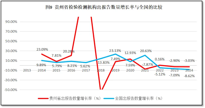 贵州省检验检测机构出具报告数量的增长率与全国检验检测机构出具报告增长率的比较如图9所示。