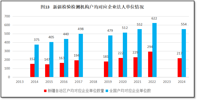 由图13可见,12年来,新疆维吾尔自治区检验检测机构户均对应的企业法人单位数量增长不显著,且一直低于全国平均数。2024年新疆维吾尔自治区检验检测机构户均对应企业法人单位217个,不及全国平均数554个的一半,低了337个。以2024年度的统计数据计[ 国家统计局未公布2013、2018、2023年度的企业法人单位统计数据。],新疆维吾尔自治区地区企业法人单位数量超过28.5万个,位居全国第27位,排名相对靠后(且比2023年度排名还下滑了2位),比新疆维吾尔自治区检验检测机构的数量在全国的排名更低。这说明,对于新疆维吾尔自治区的企业法人单位数量来说,新疆维吾尔自治区地区检验检测机构数量也显得多了一些,现有的企业法人单位数量在承载新疆检验检测行业发展上相当吃力,供过于求现象严重,预期竞争激烈,不利于检验检测行业的高质量发展。