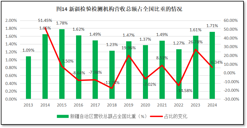 由图14可见,新疆维吾尔自治区检验检测机构营收总额在全国检验检测行业营收总额中的比重呈现一个先增后跌再增的N型曲线特点,从2013年的1.09%增长到2015年的1.78%之后开始略微下降,之后在1.2%左右波动徘徊,到2024年又回升到1.71%。从增长率曲线来看,除了头一年的异常数据,新疆维吾尔自治区检验检测机构营收总额占比增长率从2015年以后就多数年份保持在低位,只是在2019年和2023年出现了较高增幅,10年来的年均增幅为1.31%,说明新疆维吾尔自治区检验检测机构在全国的地位和贡献比较稳定,发展比较稳健,但排位靠后。