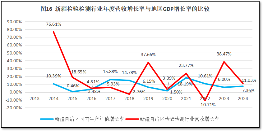 来看新疆维吾尔自治区GDP年度增长曲线与新疆维吾尔自治区检验检测机构年度营收总额增长曲线的比较,如图16所示。