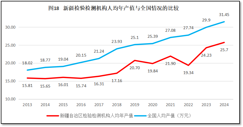 新疆维吾尔自治区检验检测机构人均年产值与全国的情况比较如图18所示。