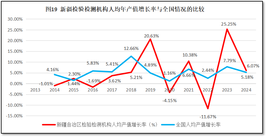 再来看新疆维吾尔自治区检验检测机构人均年产值增长率与全国人均年产值增长率的比较,如图19所示。