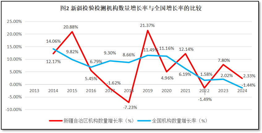 新疆维吾尔自治区检验检测机构数量增长率与全国检验检测机构数量的增长率进行比较,结果如图2所示。