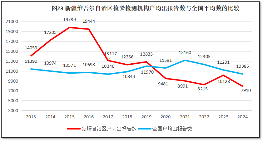 由图23可见,新疆维吾尔自治区检验检测机构户均出报告数量变动幅度很大,在2019年之前,新疆维吾尔自治区检验检测机构出具报告数量一直高于全国平均数,并且在2015年前后增长到1.9万份以上的高值。不过,从2016年开始,新疆检验检测机构出具的报告数量开始下降,在2019年之后新疆检验检测机构户均出具报告数量已经低于全国平均数,2023年新疆维吾尔自治区检验检测机构出具的报告数量有所回升,但仍比全国平均数略低一些。2024年新疆维吾尔自治区检验检测机构户均出具的报告数量进一步下滑,又拉大了与全国平均数的差距,低出2475份,说明新疆维吾尔自治区检验检测机构业务量持续出现下滑。