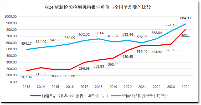 由图24可见,新疆维吾尔自治区检验检测报告的单价总体缓慢上升,比较符合一般市场发展的趋势。2013年新疆维吾尔自治区检验检测报告单价167.36元,到2024年增长到803.10元,与全国的平均数相差已经不远。总体来说,新疆维吾尔自治区检验检测报告单价逐步走高,有利于当地检验检测机构提升经济效益。