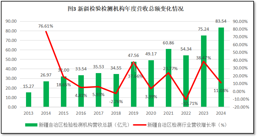 由图3可见,12年来,新疆维吾尔自治区检验检测机构营收总额波动式增长。2024年末新疆维吾尔自治区检验检测行业年度营收总额达到83.54亿元,是2013年的5.47倍。从增长率曲线来看,刨除第一年的异常数据,2015年以来新疆维吾尔自治区检验检测机构营收总额增长率起伏较大,但正增长的年份较多,从2015年到2024年的年均增速为13.02%,略高于全国的平均增速11.66%。可见,新疆维吾尔自治区的检验检测行业还处于机构数量和营收总额双增长阶段,但增长率各年起伏很大,发展很不稳定。