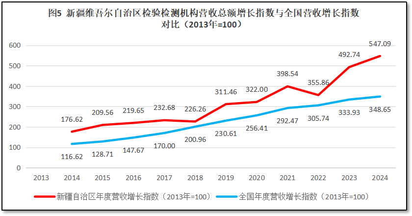 由图5可见,新疆维吾尔自治区检验检测机构营收总额增长指数一直保持着高于全国平均数的水平发展,虽然个别年份由于营收回落,两条曲线的距离有所接近,但最近两年两条曲线的距离又有扩大,2024年度增长指数的差距为198左右,有较明显优势。由此可见,新疆维吾尔自治区在过去12年里总体发展趋势比较稳健,行业发展质量较为稳定,最近几年还有加快发展速度的趋势。
