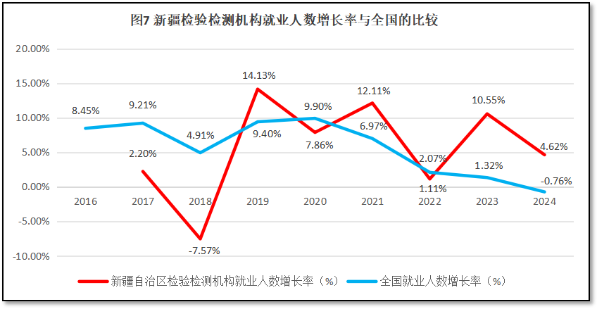 新疆维吾尔自治区检验检测机构就业人数增长率与全国检验检测机构就业人数增长率的比较如图7所示。