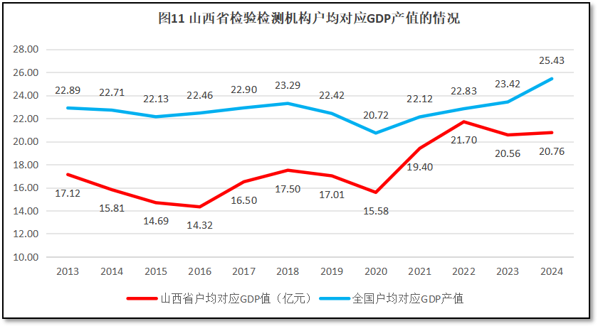 由图11可见,过去12年,山西省检验检测机构户均对应的GDP值有较大幅度的波动,经过几轮涨跌后从2013年的户均对应17.12亿元增长到2024年的户均对应20.76亿元。从山西省户均对应GDP的值与全国情况进行比较可见,山西省的数值一直低于全国平均数,差距在部分年份有缩小的趋势,但最近两年差距又有所拉大。这说明,对应于山西省当前的经济状况,现有的检验检测机构数量显得多了一些,但由于山西经济发展停止,这方面矛盾进一步突出。好在2024年山西省检验检测机构数量开始下降,再加上后续经济可能恢复增长,有望逐步缓解这一矛盾。