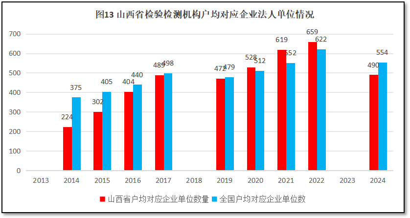 再来看检验检测机构户均对应的企业法人单位数量情况。过去12年山西省地区检验检测机构户均对应企业法人单位数量与全国情况的比较如图13所示。