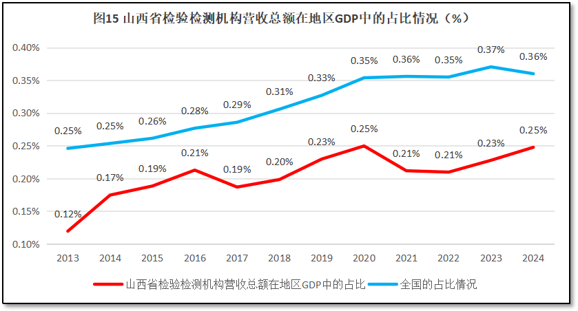 再来看山西省检验检测机构营收总额在其地区生产总值GDP中的占比情况。2024年度,山西省检验检测机构营收总额63.10亿元,占当年山西省GDP值的0.25%,比全国平均值0.36%低了0.11%,排名全国第26位,较2023年度排名提升1位。过去12年山西省检验检测机构营收总额在当地GDP值的比例变化情况如图15所示。