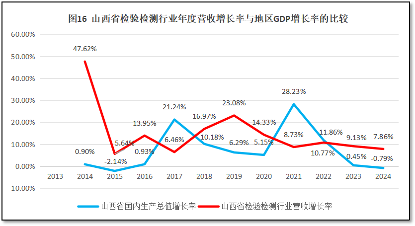 这说明,由于山西省经济发展速度一般,虽然山西省检验检测行业近十年的增长速度很快,但考虑到区域经济对检验检测行业支撑能力的限制,山西省检验检测行业加速进行转型显得更有必要。