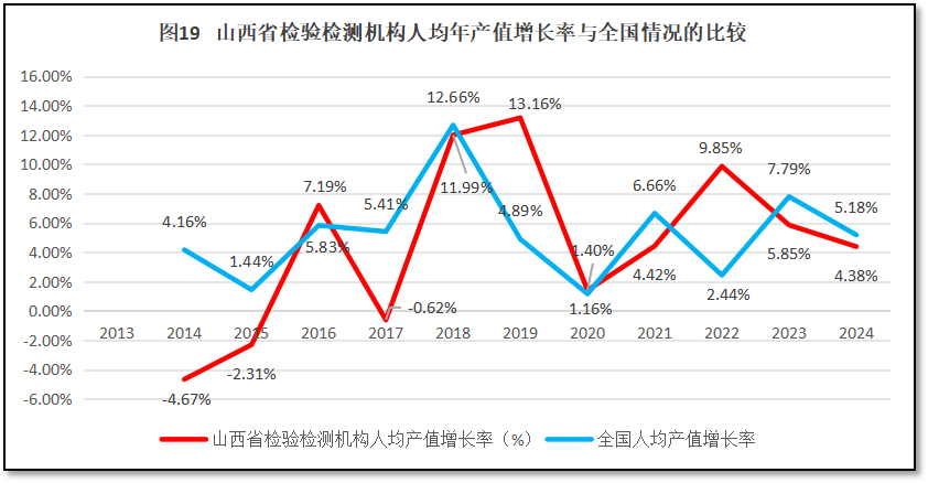 再来看山西省检验检测机构人均年产值增长率与全国人均年产值增长率的比较,如图19所示。