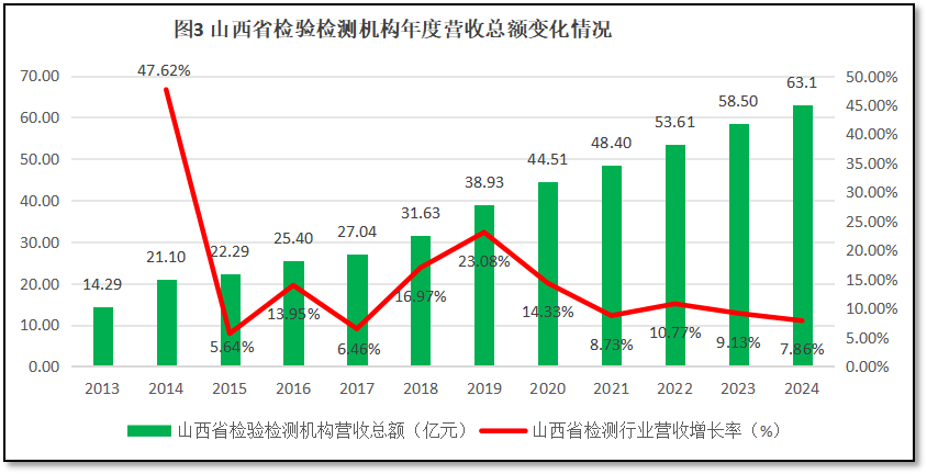 由图3可见,除了头一年数据较为失真之外,从2015年以来山西省检验检测机构营收总额总体保持较快增长。2024年末山西省检验检测行业年度营收总额达到63.10亿元,是2013年的4.41倍。从增长率曲线来看,刨除第一年的异常数据,2015年以来山西省检验检测机构营收总额增长率相对平稳,在2019年有一个超过20%的增长峰值,从2015年到2023年的年均增速为11.69%,略高于同期全国的年平均增速(11.66%)。2024年,山西省的检验检测机构数量开始出现了下降,但营收总额还在增长,说明总体经营状况较好,行业转型阶段目前较为平稳。