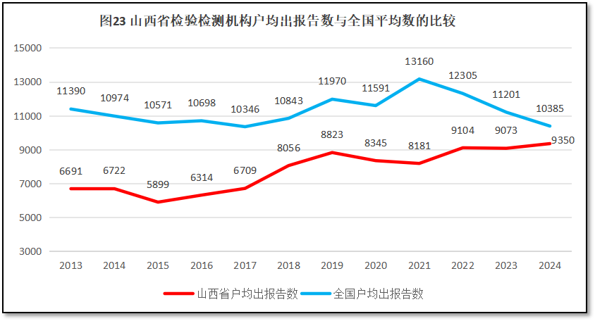 由图23可见,山西省检验检测机构户均出报告数量总体逐步增长。从2013年的6691份增长到2024年的9350份,虽然一直低于全国平均数,但由于近年来全行业出具报告数量的持续下降,山西省户均出报告数量已经拉近了与全国平均数的差距。