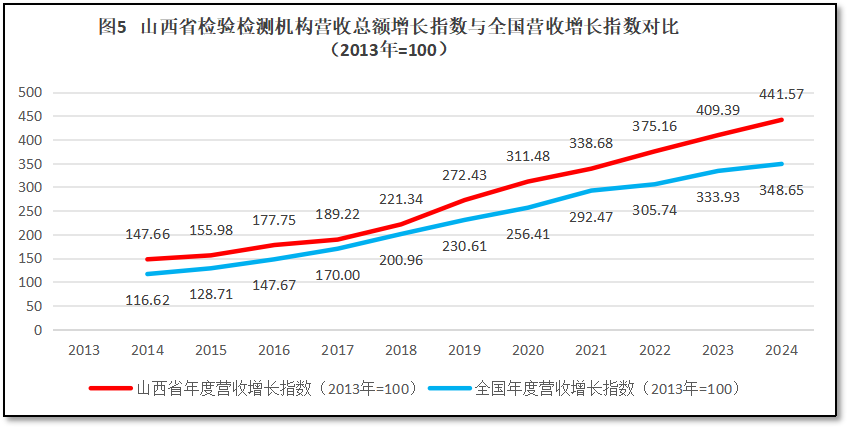 由图5可见,山西省检验检测机构营收总额增长指数一直保持着高于全国平均数的水平发展,在2017-2018年期间由于营收回落,两条曲线的距离有所接近,但最近几年两条曲线的距离又有扩大,2024年度增长指数的差距扩大为92左右,是历年最大的一次。由此可见,山西省在过去12年中总体发展趋势比较稳健,行业发展质量较为稳定,最近几年还有加快发展速度的趋势。