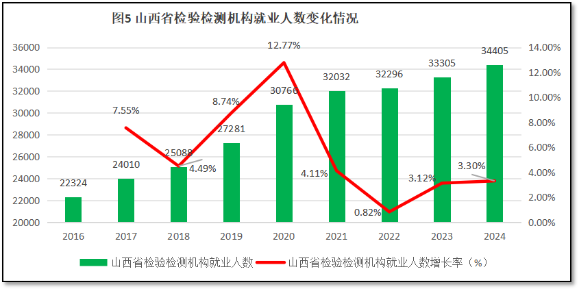 由图6可见,最近9年山西省检验检测机构从业人员数量从2016年的2.23万人增长到2024年的3.44万人,总体保持着持续增长。从增长率曲线看,2020年山西省出现了一个较高的增长峰值,此后增长率走低,最近两年保持在3%左右的年度增长率,说明尽管山西省检验检测机构数量已经停止增长,但由于效益提升情况尚好,因此吸纳就业人口的能力仍然较好。