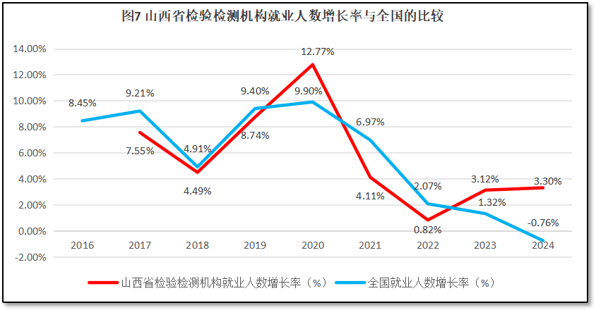 山西省检验检测机构就业人数增长率与全国检验检测机构就业人数增长率的比较如图7所示。