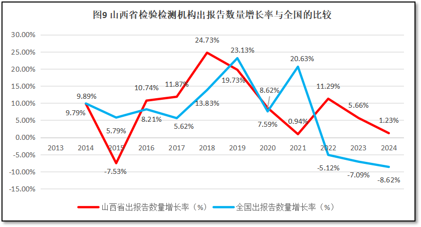 从增长率曲线来看,山西省检验检测机构出具的报告数量在2015年出现了一个较大的降幅,增长率为-7.53%;之后增长率回升,在2018年出现了一个24.73%的较高增幅,此后增长率又逐步回落。2022年山西省检验检测报告数量增长率出现一次反弹,此后最近两年持续下降,但仍保持在正增长阶段。山西省检验检测机构出具报告数量的增长率与全国检验检测机构出具报告增长率的比较如图9所示。