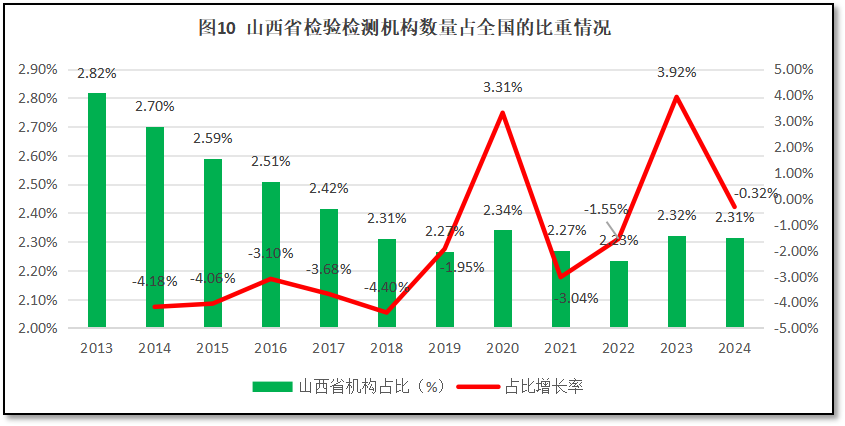 截至2024年末,山西省检验检测机构数量为1228家,约占全国检验检测机构数量的2.31%,排名全国第22位,较2023年度排名提升了1位。过去12年,山西省检验检测机构数量在全国检验检测行业中的占比以及占比的增长率如图10所示。