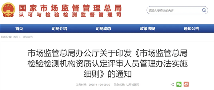 11月26日,市场监管总局办公厅印发《市场监管总局检验检测机构资质认定评审人员管理办法实施细则》,该细则适用于接受市场监管总局指派,承担资质认定技术评审工作的人员,包括资质认定主任评审员、资质认定评审员和资质认定评审技术专家。