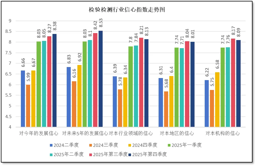 从“未来5年的信心指数”这一中期信心指标来看,四季度也出现了8.53分的历史最高分值。说明得益于十四五期间我国经济的稳健增长,即使经历中美贸易战、房地产持续低迷、外贸下降等不利因素影响,我国经济仍保持了极强的韧性,这使得人们对未来的发展,尤其是十五五期间我国经济的持续向好发展仍充满信心。此外,2025年,市场监管总局公布的检验检测行业统计数据显示,检验检测行业开始出现机构数量减少、劳动生产率提高等高质量发展特征,检验检测行业生态有望持续改善,也使得从业者们对行业发展预期向好,从而提升了对未来五年的发展信心。
